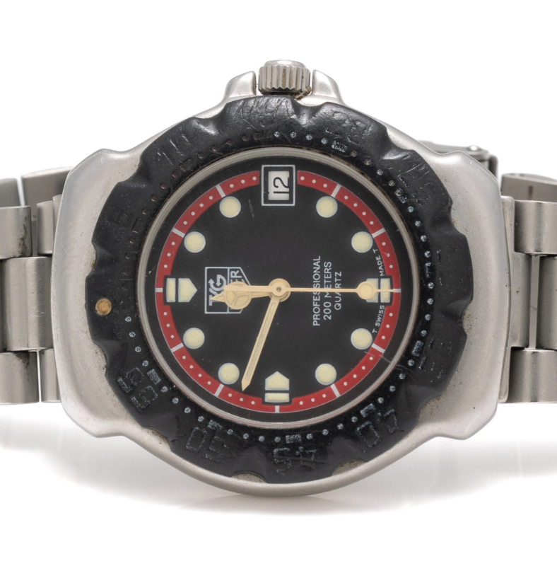 This TAG Heuer Formula 1 Ref. 371.513 circa 1988-1992 is a bold vintage sports watch from the late 1980s and early 90s, part of TAG Heuer’s first-generation Formula 1 lineup. With its deep black dial, striking red accents, and rugged bezel design, it captures the energetic, adventurous style that defined the era.